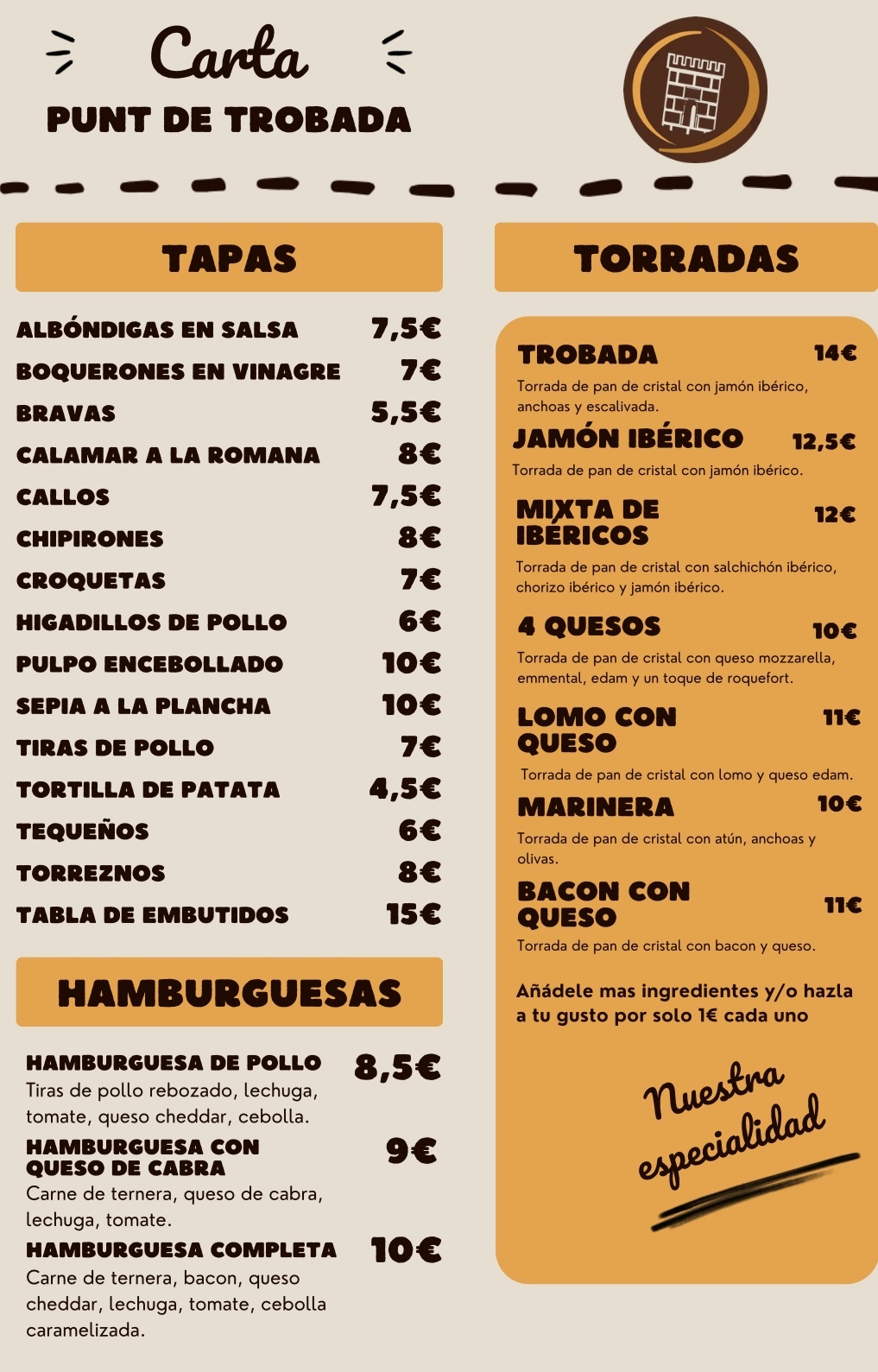 Disfruta de nuestras Torradas, Hamburguesas y bocadillos, buen ambiente, música y un equipo que te atenderá con gusto. Tenemos desayunos, comidas, cenas, postres y bebidas, además de comida para llevar.